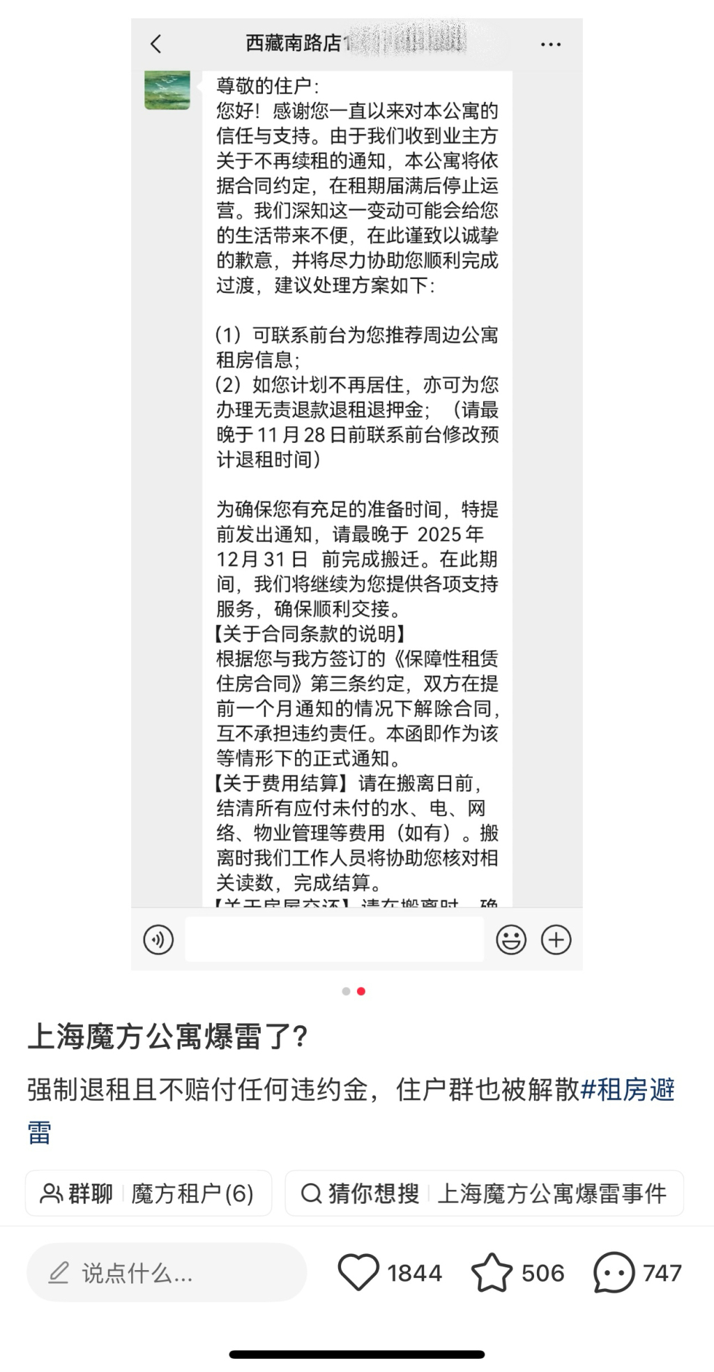 告知书同步发布了处理方案,称可联系前台推荐周边公寓租房信息;若计划不再居住,亦可办理无责退款退租退押金。在此期间,将继续提供各项支持服务,确保顺利交接。